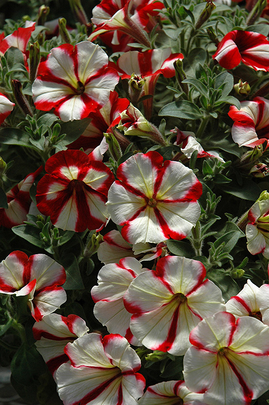 Crazytunia® Cherry Cheesecake Petunia is bathed in stunning white trumpet-shaped flowers with cherry red stripes at the ends of the stems from mid spring to late summer. Its pointy leaves remain green in colour throughout the season.