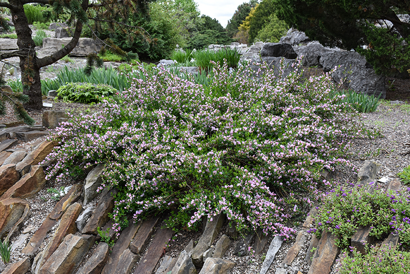 A functional yet quite attractive low shrub when in bloom, with spreading branches smothered in purplish-pink flowers in late spring; somewhat diminutive the rest of the year but not unattractive; extremely tough and durable, makes a great groundcover