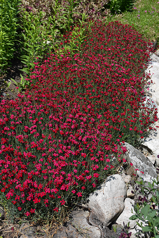 Flashing Light Maiden Pinks will grow to be only 6 inches tall at maturity extending to 8 inches tall with the flowers, with a spread of 18 inches. When grown in masses or used as a bedding plant, individual plants should be spaced approximately 14 inches apart. Its foliage tends to remain low and dense right to the ground. It grows at a medium rate, and under ideal conditions can be expected to live for approximately 5 years. As an evegreen perennial, this plant will typically keep its form and foliage year-round.