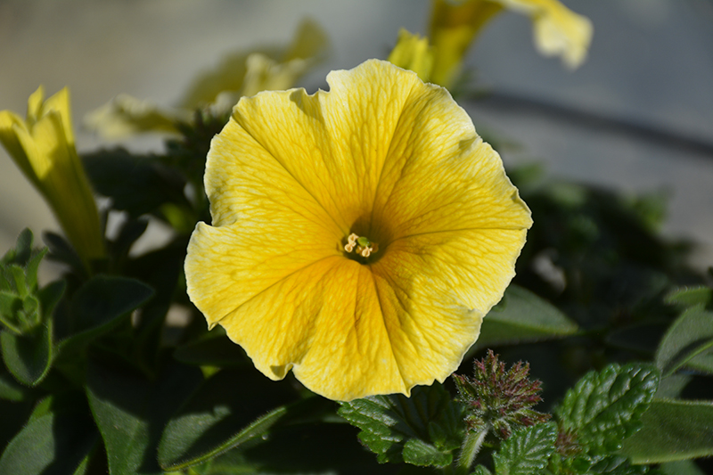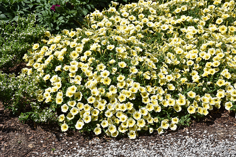Bee's Knees Petunia is smothered in stunning buttery yellow trumpet-shaped flowers with yellow centers at the ends of the stems from mid spring to early fall. Its pointy leaves remain dark green in colour throughout the season.