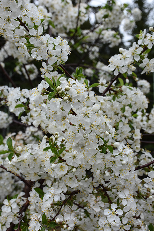 Juliet Cherry features showy clusters of fragrant white flowers along the branches in mid spring. It has green deciduous foliage. The glossy oval leaves turn yellow in fall. The fruits are showy dark red drupes carried in abundance from mid to late summer.